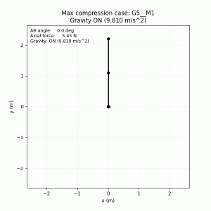 Two-LinkForceLab is a Python project that simulates axial force in a planar two-link mechanism across 25 geometry-motion cases, with gravity on/off comparisons and visual engineering outputs.